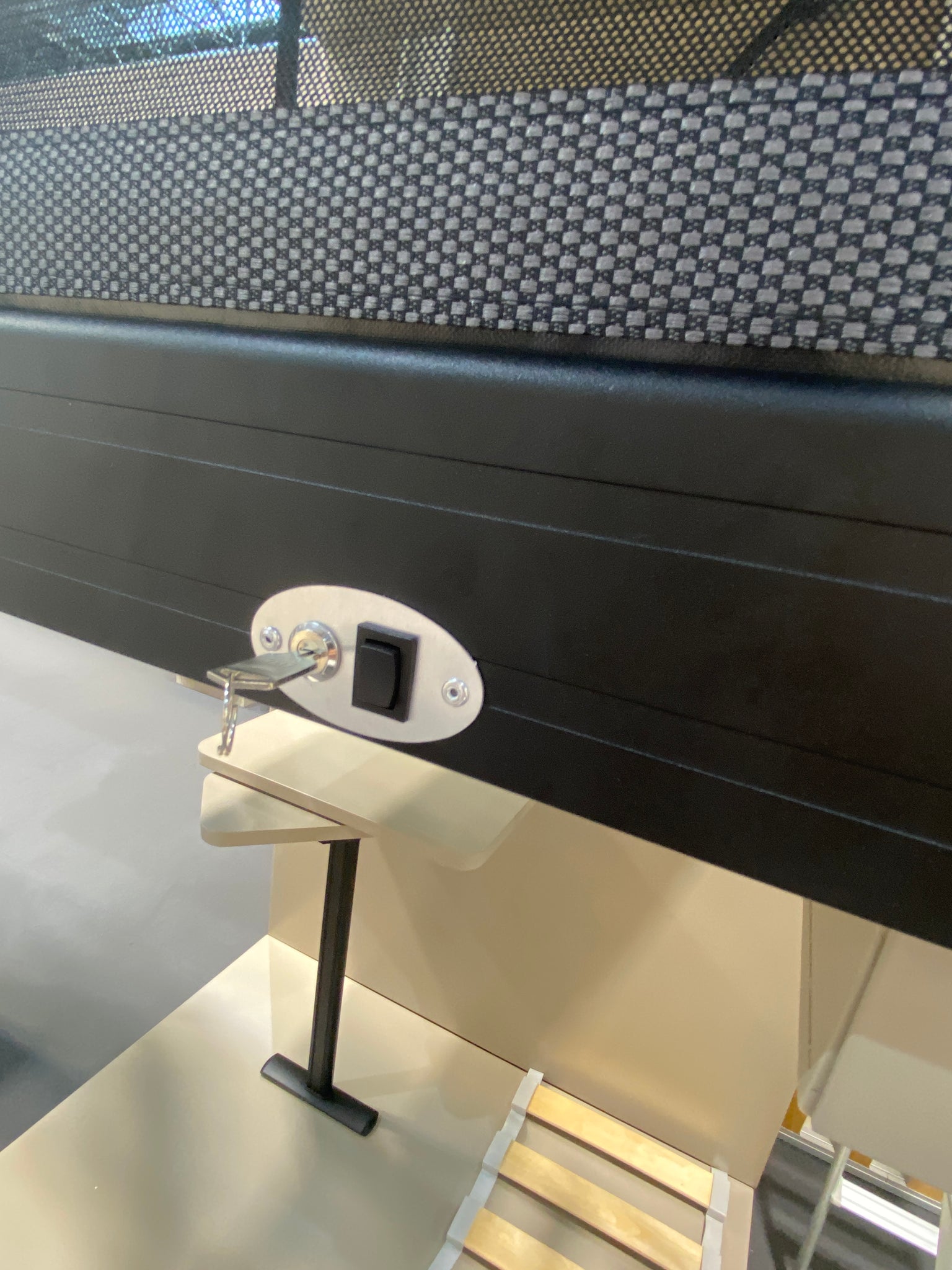 Son système de levage électrique par sangles, fiable et parfaitement intégré, permet un positionnement précis du couchage. Ce système permettra de laisser place à un espace de vie plus conséquent une fois levé.