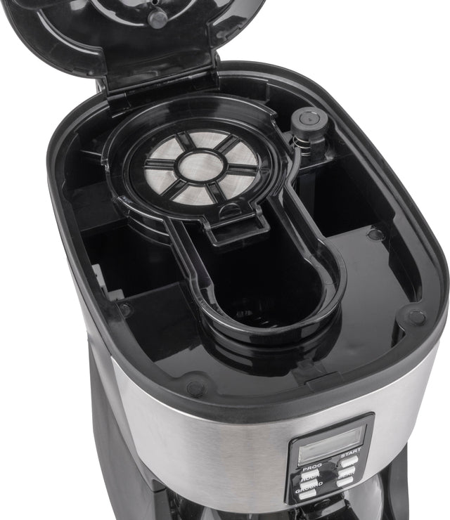 Conçue pour être énergiquement efficace elle consomme peu d'électricité et intègre une fonction d'arrêt automatique après 2 heures de maintien au chaud. Son panier-filtre relevable permet une utilisation facile avec du café moulu, tandis que les pieds antidérapants assurent une stabilité optimale lors de la préparation.